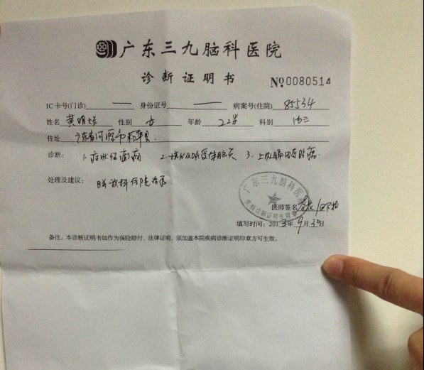 2013年9月16日,黄明烂因为在公司实习期间不满意自己的业绩,觉得有愧于公司,在公司的总结大会上出现哭闹哭泣等行为,这些,我们都以为是一个刚刚出到社会的大学生在面对挫折时显露出来不坚强的正常现象。但是,事情并没有这么简单。回到宿舍休息后,黄明烂仍情绪不稳定,易激动,时而哭闹,身体出现明显不适,联系到黄明烂家人后,其家人带她去医院检查,检查期间黄明烂情绪易激惹,思维松弛,对自身情况无认识及批判能力,自知力缺乏。询问病情时,黄明烂答非所问。 医院相关检查显示: